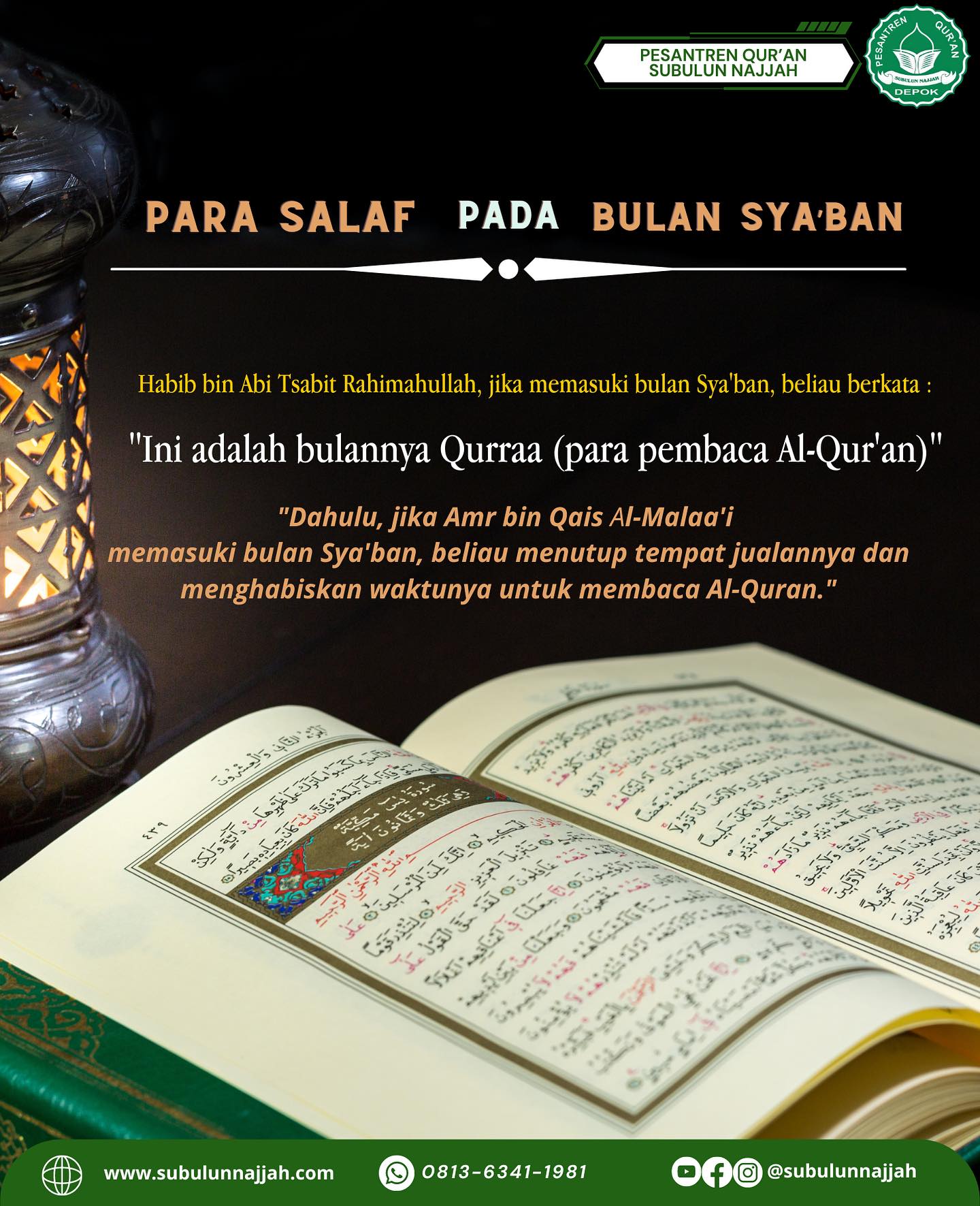 Maka, bulan Sya’ban adalah bulan memperbanyak membaca Al-Quran yang Mulia. Tidak lebih baik daripada membacanya di luar bulan Sya’ban, kecuali tentu bulan Ramadhan, di mana Al-Quran diturunkan. Maka termasuk persiapan menyambut Ramadhan secara lahir, batin, jasmani, akal dan hati. Termasuk yang pokok yakni dengan banyak membaca Al-Quran, menghafalnya dan merenungkan maknanya dan kandungannya.